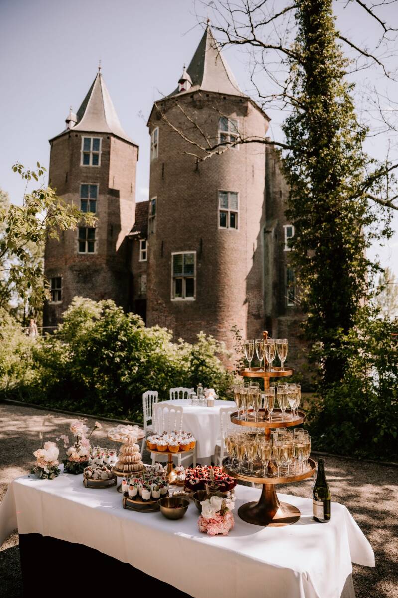Het is ook leuk om div taarten en gebakjes, afgewisseld met wat glaasjes te serveren op een Sweet table, naar wens in een bepaalde kleur, op meegeleverde etageres, planken, schalen of boomstamschijven. Voor elk wat wils!